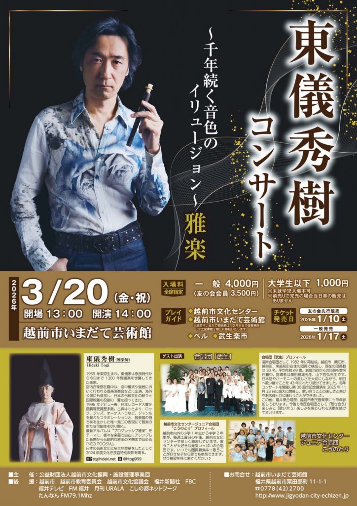 3/20(金祝) 東儀秀樹コンサート~千年続く音色のイリュージョン~雅楽(越前市) コンサートnew !